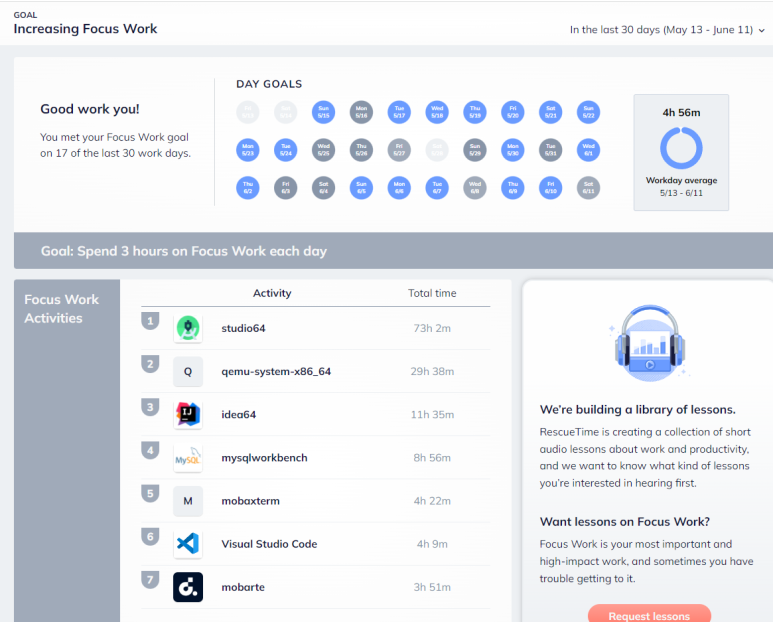오늘 기준 지난 30일간 총 17번 목표 달성에 성공하였고 평균 하루에 4시간 56분 순수 코드를 작성했다.