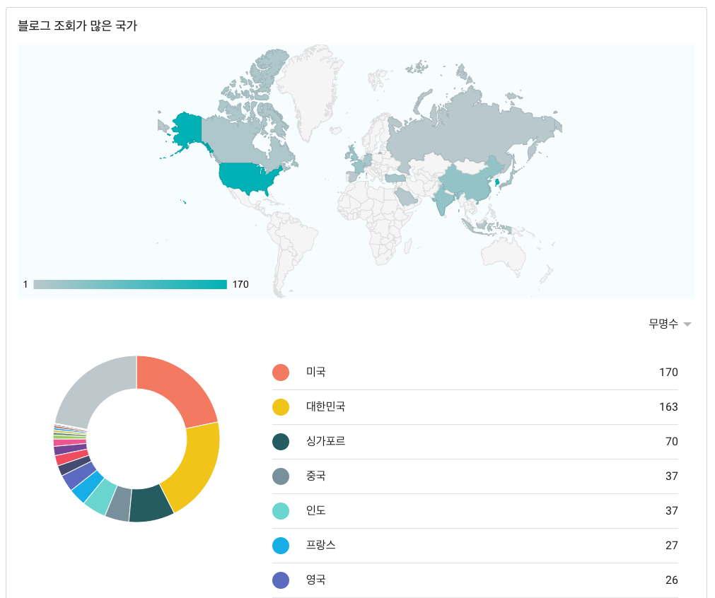 오늘을 기점으로 내 블로그에 들어오는 ip의 국적 비율이 미국이 1등이 되었다.